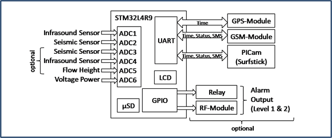 - Alarm Output: Two different Alarm Levels (depending on event magnitude), Output signal via Relay or RF-Module, SMS-Alert, Event-Message to Server, E-Mail Alert